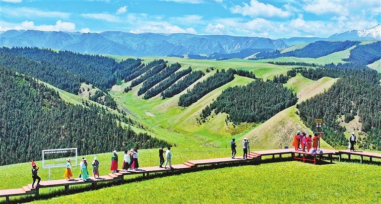 藍(lán)天白云下,裝有護(hù)欄的木棧道在山間蜿蜒盤(pán)旋,外地游客站在棧道上,正在饒有興趣地伸手投喂溫順的馬鹿。