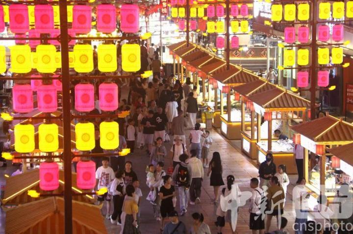 2024年8月17日,游客在甘肅省敦煌夜市游覽。進入暑期以來,被譽為敦煌“夜景圖”的敦煌夜市日均客流量達3萬人次以上,游客在這里賞景游覽休閑,品嘗地方名優(yōu)小吃,選購敦煌特色文創(chuàng)產品,感受敦煌文化魅力,夜經濟活力四射。中新社發(fā) 張曉亮 攝