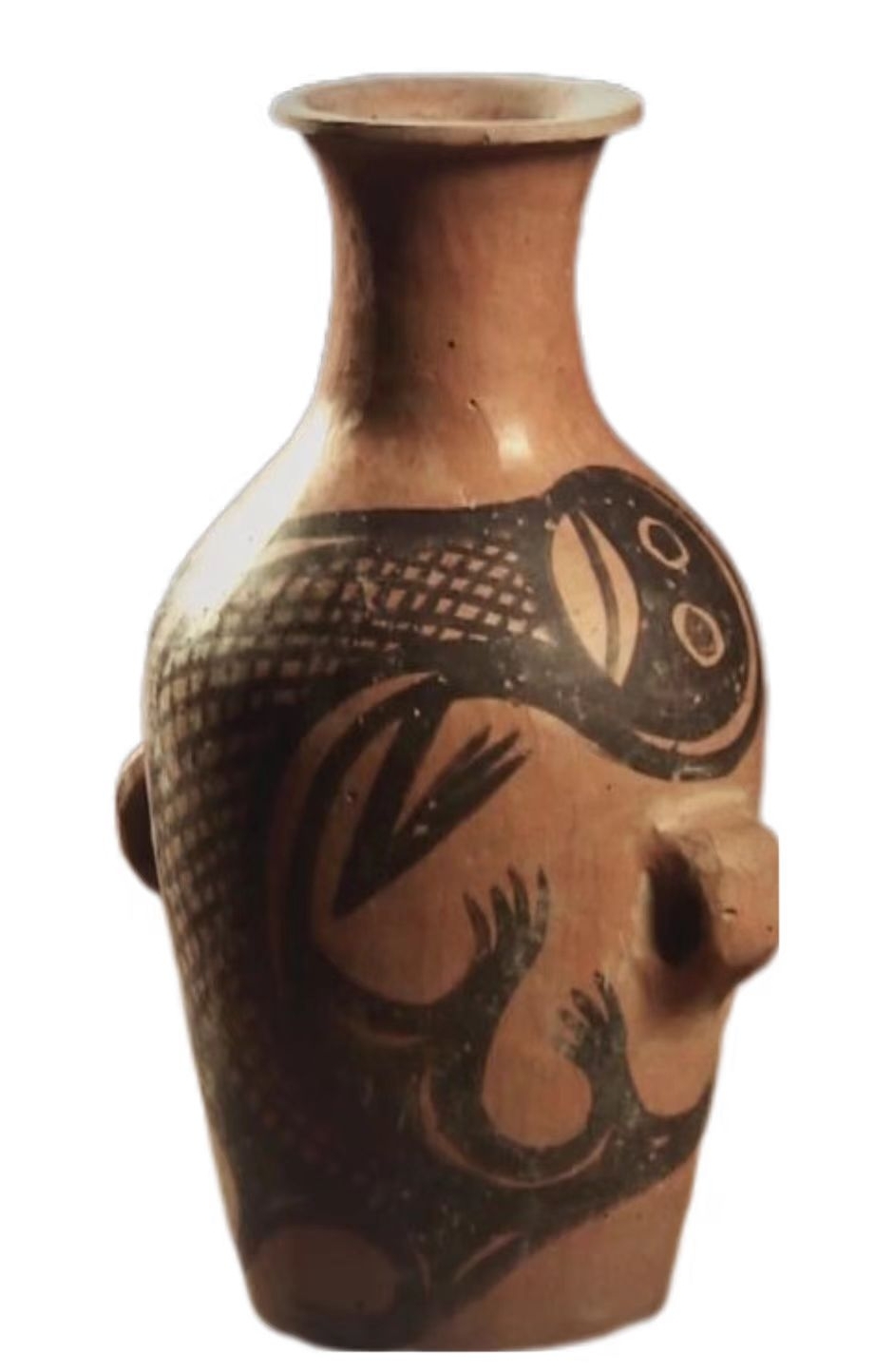 這件鯢魚(yú)紋彩陶瓶為泥質(zhì)紅陶,高18.5厘米,口徑寬5.7厘米,底徑7厘米,腹徑14厘米,重430克。陶瓶最顯著的特征是在腹部繪有動(dòng)物圖紋。動(dòng)物的身子呈蜷曲狀,尾巴向上翹舉,交于頭上。臉?biāo)迫嗣?,雙眼圓睜而有神。嘴巴寬闊,顎下有須,頭頂兩側(cè)有伸出的節(jié)肢狀腮。奇怪的是,它只有一對(duì)前肢,肢端有張開(kāi)的四肢。陶瓶身上繪制有網(wǎng)格狀的線紋。線條流利而生動(dòng),變化豐富,展現(xiàn)出了熟練自如的繪畫技巧。從鯢魚(yú)圖案的繪制來(lái)看,紋飾用筆鋒畫作的線條遒勁有力,頓挫有致。粗細(xì)不同的線條之間,還凸顯出了圖紋部位的主次。彩陶的出現(xiàn),也似乎在見(jiàn)證著先祖?zhèn)冊(cè)谑庝离x居、不常厥邑的歲月中所經(jīng)歷的那些艱難生活。