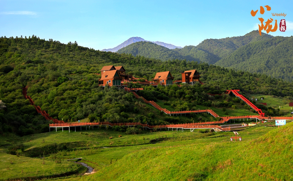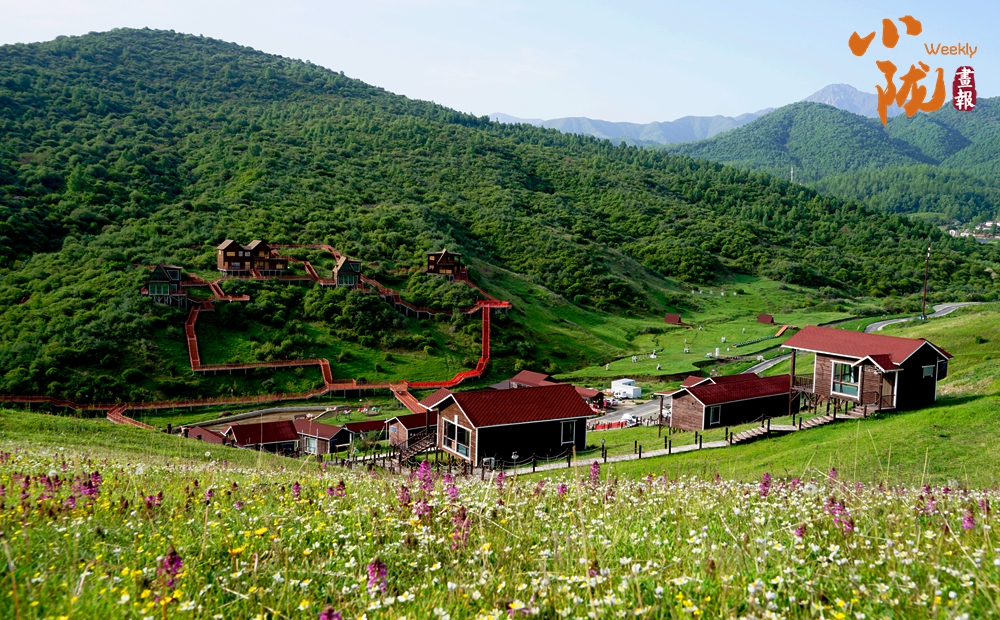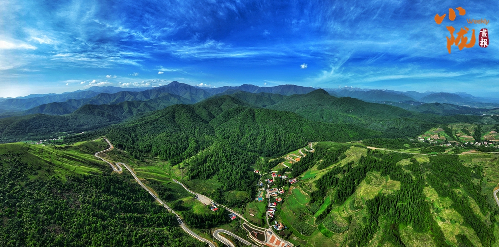 放眼望去,山峰起起伏伏,宛如鋪上了一層綠毯。山巒與草坡、森林及紅瓦白墻映入眼簾,景區(qū)道路伸向遠(yuǎn)方。