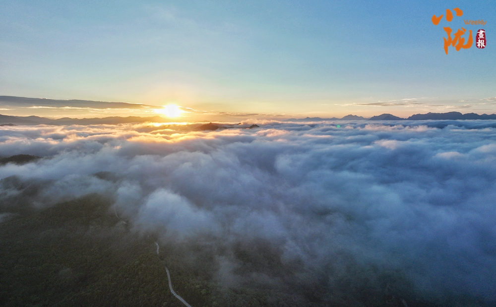 重山峻嶺間,白云如棉花般柔軟,遠(yuǎn)處的群峰在朝陽映照和云霧的烘托下,勾勒出一幅綠色畫卷。