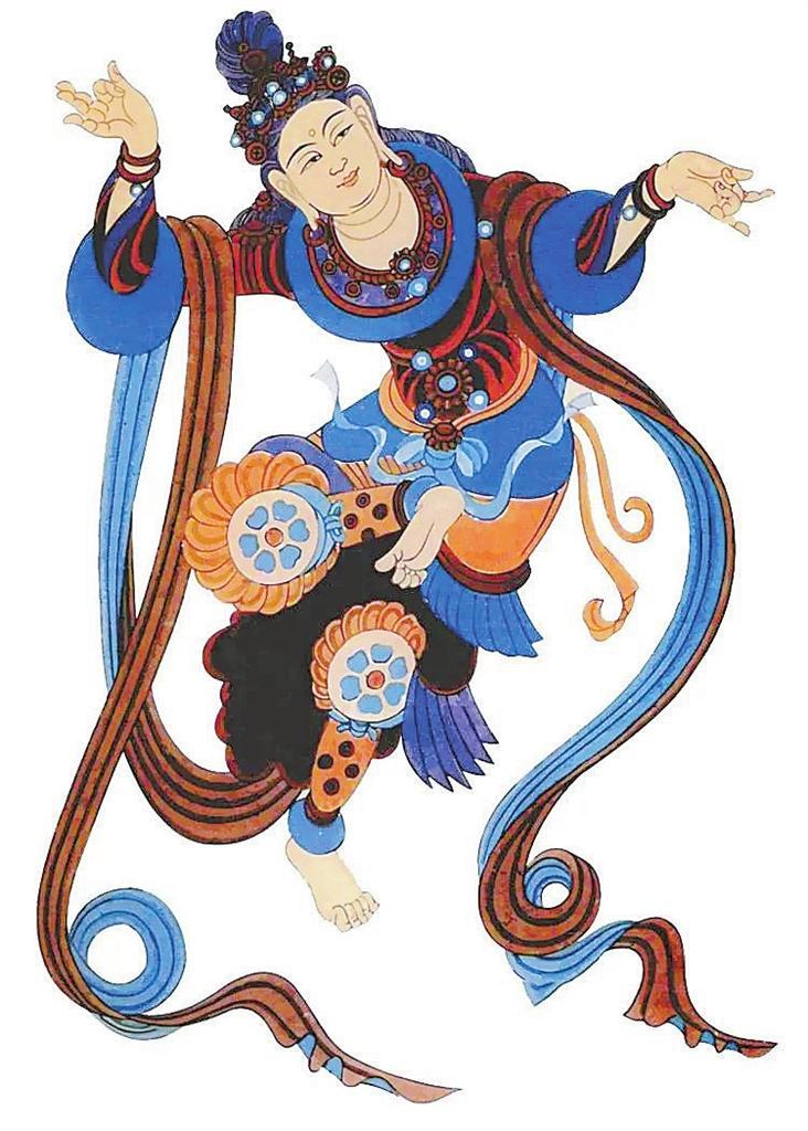 敦煌莫高窟,窟窟有壁畫,拼接起來長達(dá)45000多平方米,有世界上“最大畫廊”之稱。這些壁畫中,幾乎每幅都有舞蹈形象,如在窟頂、龕楣、藻井遨游的飛天,憑欄上的天宮伎樂,經(jīng)變畫中的娛佛、敬佛的獻(xiàn)舞者——伎樂天,出行圖中跳著具有濃郁生活氣息的世俗樂舞,以及富有舞蹈美感的彩塑菩薩、天王力士等,琳瑯滿目,精妙絕倫。這些舞蹈形象充分反映了從十六國北朝至元代千余年來不同歷史時期的舞蹈服飾、形態(tài)、風(fēng)貌,為我們挖掘、整理、弘揚中華民族舞蹈文化提供了十分珍貴的形象資料。
