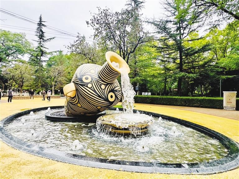 走進(jìn)公園(東口),入口處以“大河厚土孕彩陶”為主題的彩陶墻格外顯眼,墻上鑲嵌著不同造型和樣式的彩陶,分別介紹了大地灣文化彩陶、仰韶文化彩陶、馬家窯文化彩陶、齊家文化彩陶四個(gè)不同歷史發(fā)展時(shí)期。沿健身步道向西行進(jìn),體量巨大的馬家窯旋紋彩陶尖底瓶正向旋紋彩陶盆內(nèi)倒入“黃河之水”,這一景觀(guān)便是“彩陶流水”節(jié)點(diǎn),景觀(guān)造型采用跌水、涌泉的形式,打造出彩陶流水的動(dòng)態(tài)效果,象征著黃河文化的源遠(yuǎn)流長(zhǎng)。