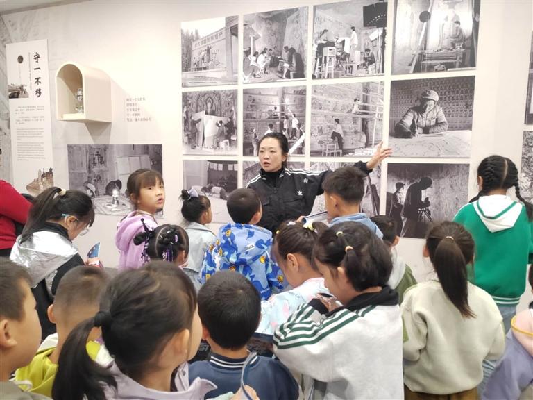 為了使小朋友們能夠身臨其境感受敦煌文化的魅力,主持人還為每一位小朋友發(fā)放了一本“敦煌小畫師”的研學(xué)手冊,并帶領(lǐng)大家前往蘭州市圖書館“近鄰”——敦煌藝術(shù)館進行了一場藝術(shù)研學(xué)之旅。在敦煌藝術(shù)館內(nèi),孩子們見證了第220號石窟的壯觀,欣賞了館內(nèi)200余件文化展品,追溯了莫高窟的歷史淵源,了解了壁畫繪制和建筑元素的藝術(shù)審美,學(xué)習(xí)了“壁上丹青”的顏料密碼。