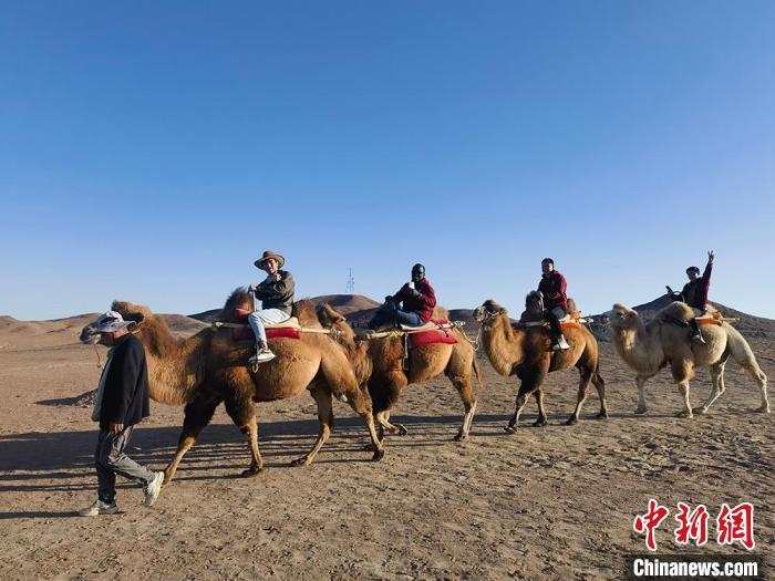 圖為留學(xué)生在陽關(guān)景區(qū)體驗(yàn)乘騎駱駝。劉玉桃 攝