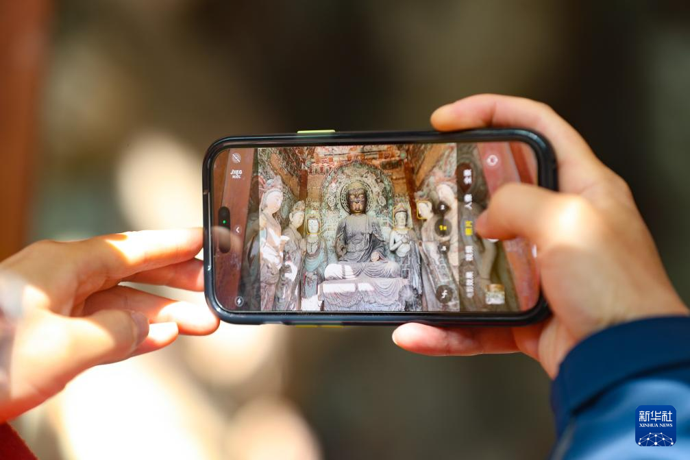 11月2日,游客在麥積山石窟參觀游覽時用手機拍攝開放洞窟彩塑。新華社記者 郎兵兵 攝