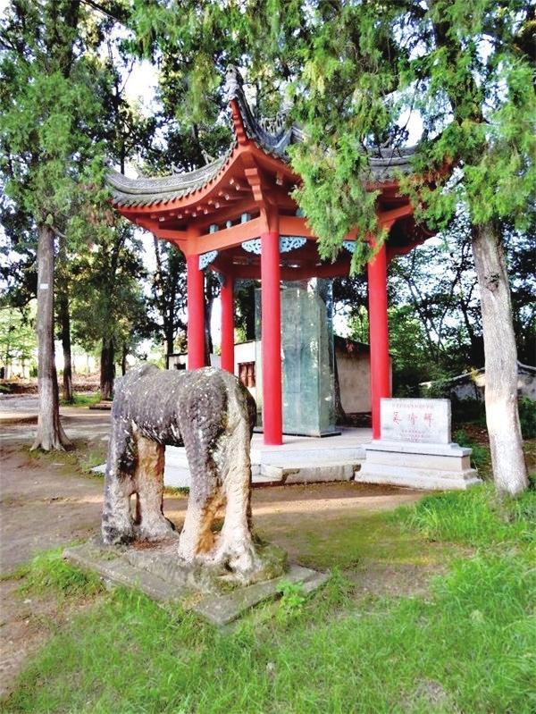 到達(dá)山頂?shù)膮谦d墓,眼前出現(xiàn)的是兩尊相向而立高大的宋代石人,石人的不遠(yuǎn)處是一對(duì)相互對(duì)望的石馬。在這兩匹宋代高大石馬的后面,是一個(gè)由六根朱紅色木柱擎起的六角亭。亭子里一塊石碑矗立其間,碑上刻著 “宋故開(kāi)府吳公墓志銘”。