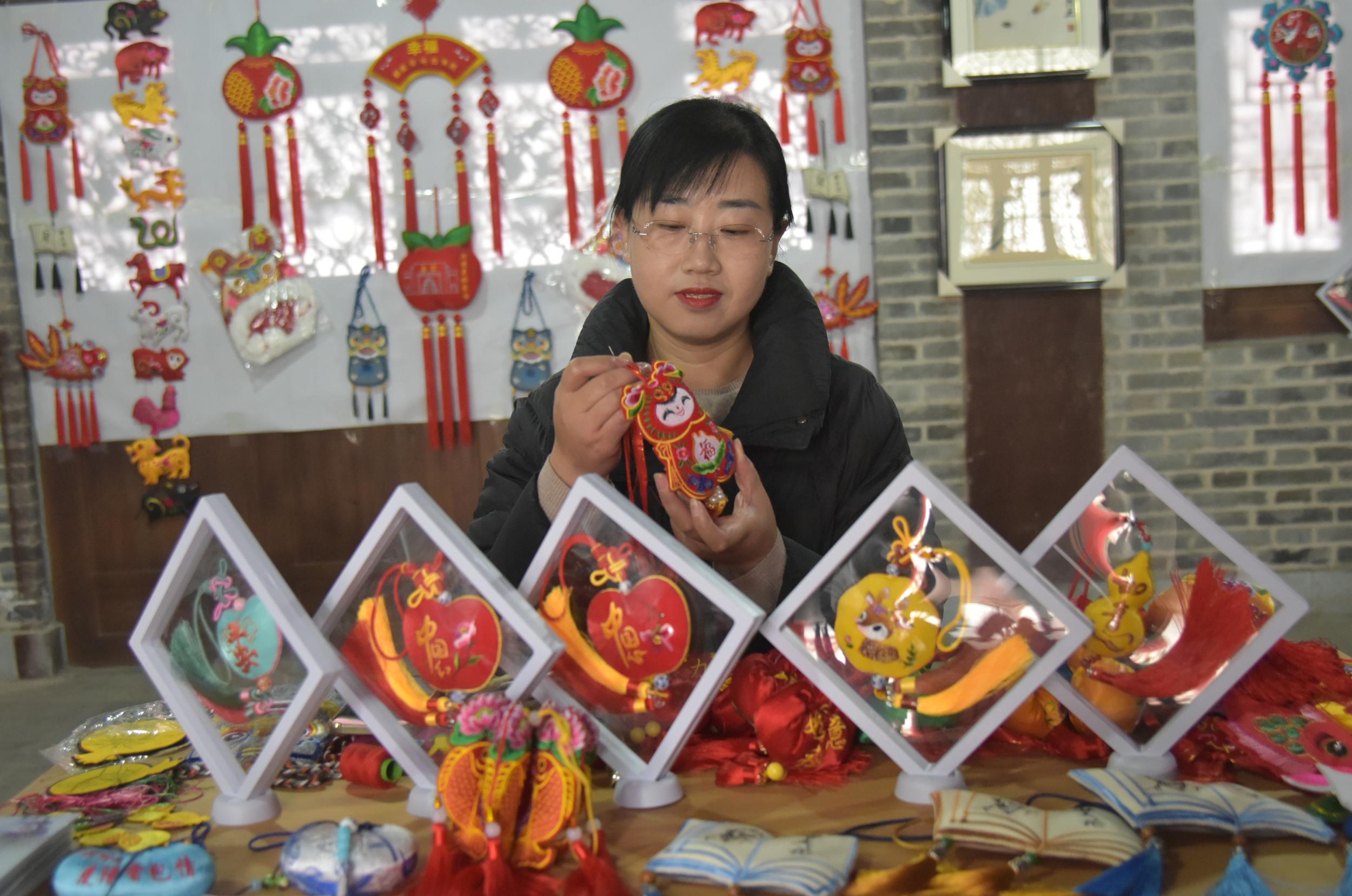 除了剪紙,鎮(zhèn)原縣香包、刺繡、書法等傳統(tǒng)文化藝術(shù)氛圍也很濃厚,深受廣大群眾喜愛。在文化一條街,十幾家書畫、香包、刺繡工作室緊挨,組成了一條文化長廊,除了銷售文創(chuàng)產(chǎn)品外,還承擔(dān)著非遺文化傳承和技藝培訓(xùn),熱鬧而又成氣候。“作為一名非遺傳承人,不僅要把自己的香包刺繡產(chǎn)品設(shè)計好、做精致,更重要的是要把這門技藝教給更多的人,讓香包、刺繡這門技藝更好地傳承下去。”慶陽香包刺繡非物質(zhì)文化遺產(chǎn)傳承人任艷艷說,自己在文化一條街已經(jīng)開店近十年了,帶出了很多巧媳婦巧婆婆,還不時受邀在縣內(nèi)外進行培訓(xùn)指導(dǎo)。