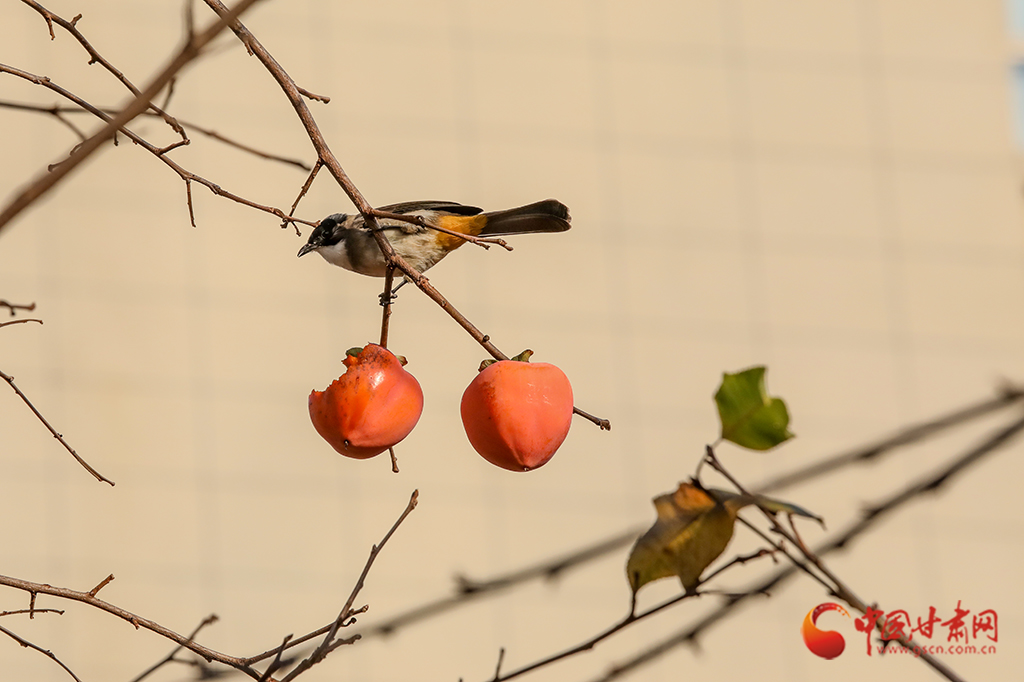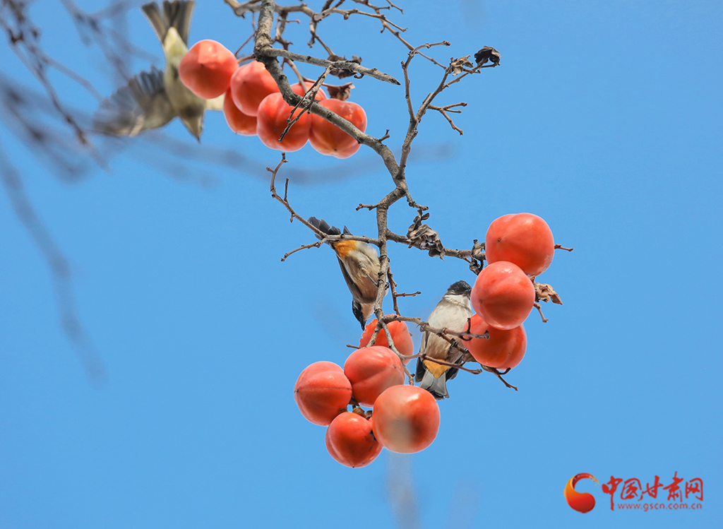 繁華落盡,枝條上一簇簇、一叢叢火紅的柿子在微風(fēng)中搖曳,吸引麻雀前來“聚餐”。麻雀們時(shí)而啁啾歡唱,時(shí)而蹦跳覓食,小巧的身影與柿子交織在一起,勾勒出一幅生動(dòng)的冬日畫卷。