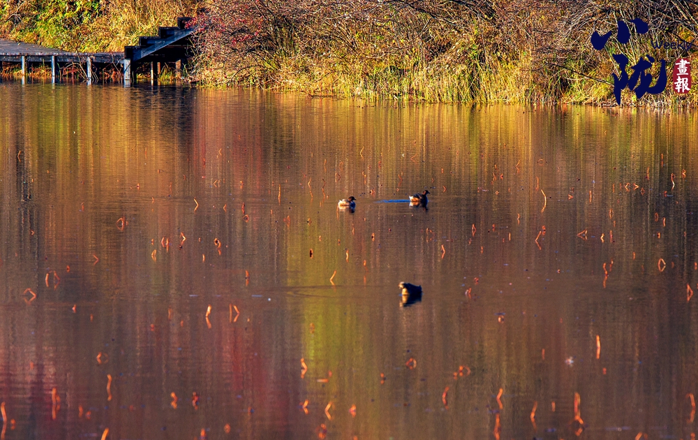 湫水深不可測,湫池依偎在深林密樹旁邊,湫面蕩起縷縷波紋,浮光泛金,一群悠閑的野鴨在水面上游來游去?!?/p>