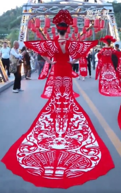 慶陽剪紙?jiān)从谏?、講究情趣,是勞動(dòng)人民生產(chǎn)生活、情感氣質(zhì)、觀念習(xí)俗和文化傳承的結(jié)晶。著名民俗學(xué)家靳之林先生稱剪紙藝人是“真正的藝術(shù)家”。1986年,中央美術(shù)學(xué)院邀請鎮(zhèn)原縣民間美術(shù)大師祁秀梅赴北京進(jìn)行民間美術(shù)教學(xué)交流,向大學(xué)生演示民間剪紙。法國、日本、澳大利亞等國家的藝術(shù)家也多次專程到隴東考察民間剪紙藝術(shù)。慶陽剪紙已由鄉(xiāng)村婦女手中的小玩意,堂而皇之地步入了國家藝術(shù)殿堂——中國民間美術(shù)館,并在日、意、澳等國家展覽亮相。圖為身著慶陽剪紙服裝的模特們行走在蘭州中山橋上,驚艷了來往的游客。