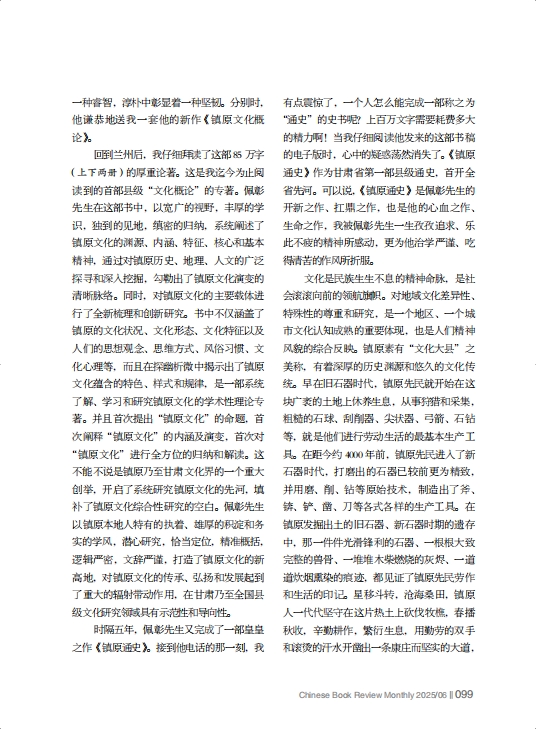 回到蘭州后,我仔細(xì)拜讀了這部85萬字(上下兩冊)的厚重論著。這是我迄今為止閱讀到的首部縣級“文化概論”的專著。佩彰先生在這部書中,以寬廣的視野,豐厚的學(xué)識,獨到的見地,縝密的歸納,系統(tǒng)闡述了鎮(zhèn)原文化的淵源、內(nèi)涵、特征、核心和基本精神,通過對鎮(zhèn)原歷史、地理、人文的廣泛探尋和深入挖掘,勾勒出了鎮(zhèn)原文化演變的清晰脈絡(luò)。同時,對鎮(zhèn)原文化的主要載體進(jìn)行了全新梳理和創(chuàng)新研究。書中不僅涵蓋了鎮(zhèn)原的文化狀況、文化形態(tài)、文化特征以及人們的思想觀念、思維方式、風(fēng)俗習(xí)慣、文化心理等,而且在探幽析微中揭示出了鎮(zhèn)原文化蘊(yùn)含的特色、樣式和規(guī)律,是一部系統(tǒng)了解、學(xué)習(xí)和研究鎮(zhèn)原文化的學(xué)術(shù)性理論專著。并且首次提出“鎮(zhèn)原文化”的命題,首次闡釋“鎮(zhèn)原文化”的內(nèi)涵及演變,首次對“鎮(zhèn)原文化”進(jìn)行全方位的歸納和解讀。這不能不說是鎮(zhèn)原乃至甘肅文化界的一個重大創(chuàng)舉,開啟了系統(tǒng)研究鎮(zhèn)原文化的先河,填補(bǔ)了鎮(zhèn)原文化綜合性研究的空白。佩彰先生以鎮(zhèn)原本地人特有的執(zhí)著、雄厚的積淀和務(wù)實的學(xué)風(fēng),潛心研究,恰當(dāng)定位,精準(zhǔn)概括,邏輯嚴(yán)密,文辭嚴(yán)謹(jǐn),打造了鎮(zhèn)原文化的新高地,對鎮(zhèn)原文化的傳承、弘揚(yáng)和發(fā)展起到了重大的輻射帶動作用,在甘肅乃至全國縣級文化研究領(lǐng)域具有示范性和導(dǎo)向性。