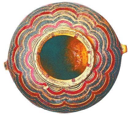 其中以馬家窯文化彩陶為代表,蘊(yùn)含著眾多神秘的社會(huì)文化信息,以線條作為造型手段、以黑色(墨色)作為主要基調(diào),奠定了中國(guó)畫(huà)發(fā)展的歷史基礎(chǔ)與以線描為特征的基本形式。馬家窯文化彩陶也是中國(guó)音樂(lè)舞蹈的開(kāi)端呈現(xiàn)。1973年,甘青地區(qū)大通縣出土的馬家窯文化彩陶舞蹈紋盆,內(nèi)壁繪舞蹈人物3組,每組5人,令人感受到遠(yuǎn)古舞蹈強(qiáng)烈的節(jié)奏感。1991年,甘肅武威市發(fā)現(xiàn)的彩陶舞蹈紋盆,內(nèi)壁繪有兩組手拉手的舞蹈人物,每組9人,舞蹈人數(shù)更多。1995年,宗日遺址再次出土一件馬家窯文化彩繪舞蹈紋盆,內(nèi)壁所繪舞蹈人物兩組,分別為11人和13人,給人一種優(yōu)雅的舞蹈意境。1986年,甘肅省永登縣出土馬家窯文化的彩陶鼓。這些珍貴的彩陶器物成為研究中國(guó)原始歌舞和音樂(lè)起源的佐證。