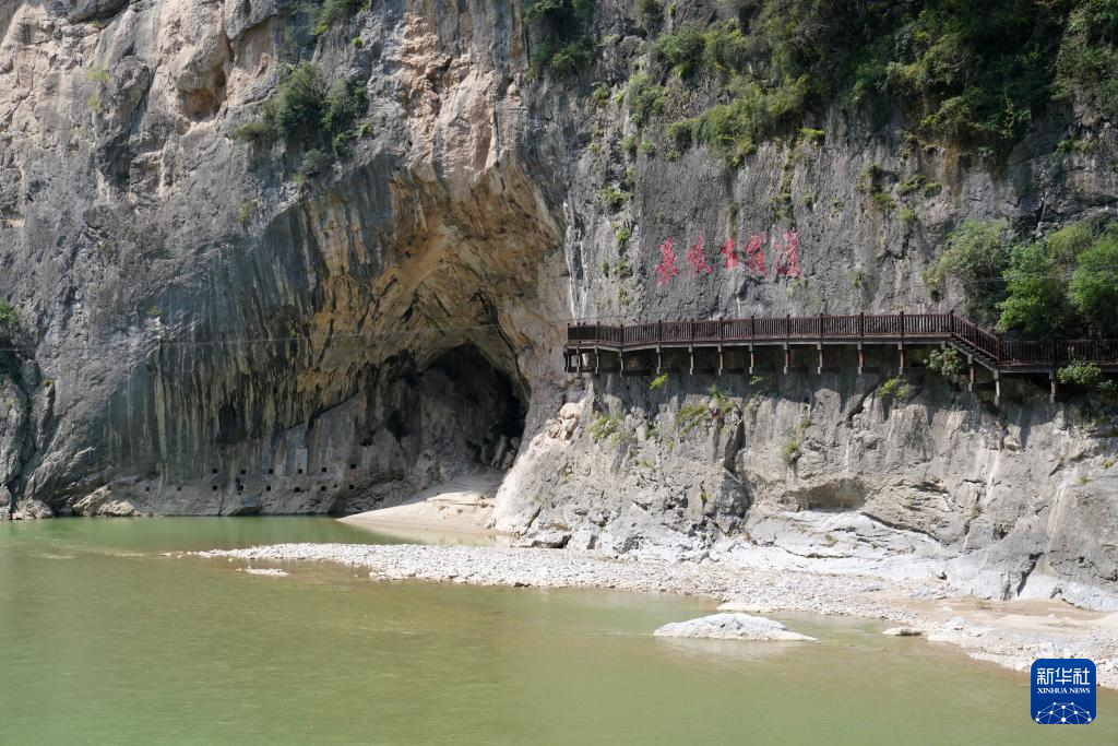 7月15日拍攝的青泥嶺下嘉陵古棧道的棧道孔遺存和復(fù)原的棧道。新華社記者 馬寧 攝