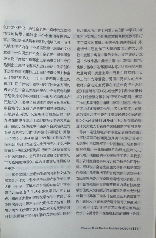 傳奇之四,金老先生是撰寫多種文體的探索者。作為一名小學畢業(yè)的農(nóng)家子弟,能認識上千字,了解標點符號的功能就非常不錯了,而金老先生從小喜歡學習,肯于鉆研,閱讀了大量的古典文學作品,背誦了不少唐宋詩詞,研習了一批現(xiàn)代文學名著,翻爛了兩本《新華字典》和兩本《現(xiàn)代漢語詞典》,從而奠定了他深厚的文學功底。同時他注重思考,善于積累,在創(chuàng)作中學習,在學習中實踐,為他熟練掌握各種文體寫作打下了堅實的基礎(chǔ)。金老先生的創(chuàng)作除小說、童話外,還創(chuàng)作了大量的散文、雜文、詩歌、童謠、寓言、報告文學、文藝評論、戲劇、小戲小品、曲藝、歌曲、彈唱、相聲、快板、楹聯(lián)、連環(huán)畫腳本等,這些作品不但數(shù)量可觀、質(zhì)量上乘,而且主題鮮明、弘揚正氣,成為愛黨、愛國、愛家鄉(xiāng)的鄉(xiāng)土教材。金老先生受聘在《蘭州晚報·農(nóng)村版》《蘭州晚報》《心理世界》《青少年攝影報》《質(zhì)量服務(wù)報》等報刊工作期間,撰寫了300多篇消息、通訊、特寫、側(cè)記、專訪、短評、綜述等新聞作品,不少有深度、有見地的稿件,還刊登在《新民晚報》《羊城晚報》《人民日報》(海外版)上。他采寫的消息《義犬救人》獲得全國晚報新聞獎消息類二等獎,這讓報社許多專業(yè)記者好生羨慕。為了讓采寫的新聞更加真實、形象、直觀,金老先生自費購買了一部照相機,隨身攜帶隨時拍攝,一批新聞?wù)掌惋L光照片又見諸報端。他拍攝的一些傳統(tǒng)手工藝、風物景觀、農(nóng)村紅白喜事照片,成為珍貴的圖像資料。可以說,金老先生在文學創(chuàng)作和新聞寫作領(lǐng)域,幾乎囊括了所有的文體,這對一個農(nóng)民作家來說,在全國也是絕無僅有的。同時,金老先生注重挖掘整理省內(nèi)具有較高史學價值的人文典故,先后撰寫各類文史資料83篇,還承擔了家鄉(xiāng)《金崖史話》的編纂工作,同時為16部電視專題片撰寫了解說詞。