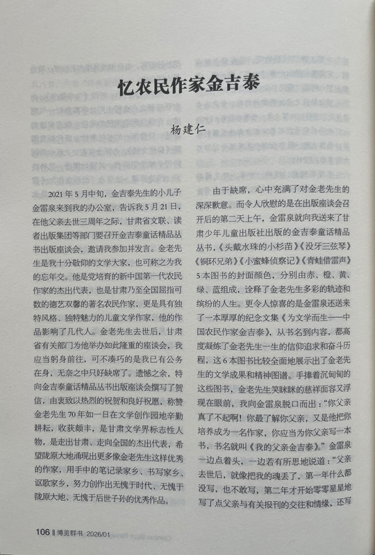 由于缺席,心中充滿了對金老先生的深深歉意。而令人欣慰的是在出版座談會召開后的第二天上午,金雷泉就向我送來了甘肅少年兒童出版社出版的金吉泰童話精品叢書,《頭戴水珠的小杉苗》《沒牙三弦琴》《銅環(huán)兄弟》《小蜜蜂偵察記》《青蛙借雷聲》5本圖書的封面顏色,分別由赤、橙、黃、綠、藍組成,詮釋了金老先生多彩的軌跡和繽紛的人生。更令人驚喜的是金雷泉還送來了一本厚厚的紀念文集《為文學而生——中國農(nóng)民作家金吉泰》,從書名到內(nèi)容,都高度凝練了金老先生一生的信仰追求和奮斗歷程,這6本圖書比較全面地展示出了金老先生的文學成果和精神圖譜。手捧著沉甸甸的這些圖書,金老先生笑瞇瞇的慈祥面容又浮現(xiàn)在眼前,我向金雷泉脫口而出:“你父親真了不起??!你最了解你父親,又是他把你培養(yǎng)成為一名作家,你應(yīng)當為你父親寫一本書,書名就叫《我的父親金吉泰》。”金雷泉一邊點著頭,一邊若有所思地說道:“父親去世后,就像把我的魂丟了,第一年什么都沒寫,也不敢寫,第二年才開始零零星星地寫了點父親與有關(guān)報刊的交往和情緣,還寫了點父親在生活和寫作中的軼事趣聞。您的建議非常好,我擔心駕馭不好,試試看吧。”我感覺金雷泉有點為難,馬上又安慰他:“不急,你用兩三年時間慢慢寫。”