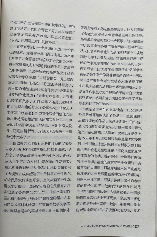 由敦煌文藝出版社出版的《我的父親金吉泰》,有108個趣味橫生的故事組成,多角度、多側(cè)面講述了金老先生學習、創(chuàng)作、生活、生產(chǎn)、為人處世等方面的生動細節(jié),用小視角折射出了大情懷,用小切口彰顯出了大境界,成功塑造了一手耕田、一手握筆的農(nóng)民作家的典型形象,生動刻畫了一生沉醉文學、癡心不改的堅守者的心靈世界,忠實記錄了金老先生70年如一日在文學創(chuàng)作園地精心耕耘的快樂時光和輝煌歷程。這本回憶錄故事講述精彩,盡管每個故事文字不長,看似生活中的平常小事,但仔細閱讀才發(fā)現(xiàn)都是精心篩選的經(jīng)典故事,讓人們看到了金老先生漫長人生途中最出彩、最可貴、最有趣的幸福時刻和生活場景。細節(jié)描述生動,故事中許多細節(jié)新鮮活潑、栩栩如生,將人們情不自禁地帶入到現(xiàn)實場面中,讀起來耐人尋味、引人入勝。情感真摯飽滿,敘述的故事幾乎都用白描的手法,親切自然,真實可信,讓讀者在深情厚誼中深刻感悟到金老先生高貴的靈魂和高尚的品格。可以說,這本書是金老先生精彩人生的高度縮影,是人品和文品相映生輝的集中展示,也是父子作家堅守文學理想的深情告白,讀來韻味悠長,感同身受,仿佛金老先生又笑瞇瞇地來到了我們身旁。