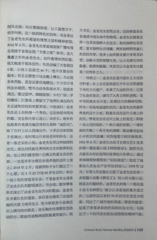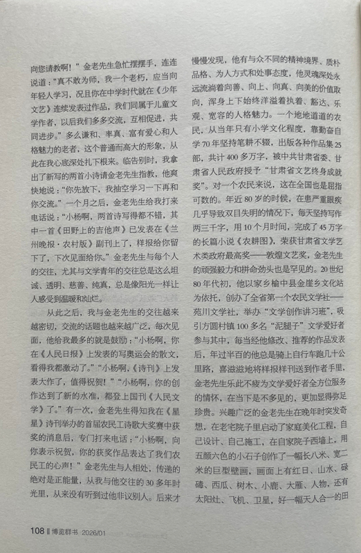 從此之后,我與金老先生的交往越來越密切,交流的話題也越來越廣泛,每次見面,他給我最多的就是鼓勵:“小楊啊,你在《人民日報》上發(fā)表的寫奧運會的散文,看得我都激動了。”“小楊啊,《詩刊》上發(fā)表大作了,值得祝賀!”“小楊啊,你的創(chuàng)作達到了新的水準,都登上國刊《人民文學》了。”有一次,金老先生得知我在《星星》詩刊舉辦的首屆農(nóng)民工詩歌大獎賽中獲獎的消息后,專門打來電話:“小楊啊,向你表示祝賀,你的獲獎作品表達了我們農(nóng)民工的心聲!”金老先生與人相處,傳遞的絕對是正能量,從我與他交往的30多年時光里,從來沒有聽到過他非議別人。后來才慢慢發(fā)現(xiàn),他有與眾不同的精神境界、質(zhì)樸品格、為人方式和處事態(tài)度,他靈魂深處永遠流淌著向善、向上、向真、向美的價值取向,渾身上下始終洋溢著執(zhí)著、豁達、樂觀、寬容的人格魅力。一個地地道道的農(nóng)民,從當年只有小學文化程度,靠勤奮自學70年堅持筆耕不輟,出版各種作品集25部,共計400多萬字,被中共甘肅省委、甘肅省人民政府授予“甘肅省文藝終身成就獎”。對一個農(nóng)民來說,這在全國也是屈指可數(shù)的。年近80歲的時候,在患嚴重眼疾幾乎導(dǎo)致雙目失明的情況下,每天堅持寫作兩三千字,用10個月時間,完成了45萬字的長篇小說《農(nóng)耕圖》,榮獲甘肅省文學藝術(shù)類政府最高獎——敦煌文藝獎,金老先生的頑強毅力和拼命勁頭也是罕見的。20世紀80年代初,他以家鄉(xiāng)榆中縣金崖鄉(xiāng)文化站為依托,創(chuàng)辦了全省第一個農(nóng)民文學社——苑川文學社,舉辦“文學創(chuàng)作講習班”,吸引方圓村鎮(zhèn)100多名“泥腿子”文學愛好者參與其中,每當經(jīng)他修改、推薦的作品發(fā)表后,年過半百的他總是騎上自行車跑幾十公里路,喜滋滋地將樣報樣刊送到作者手里,金老先生樂此不疲為文學愛好者全方位服務(wù)的情懷,在當下是不多見的,更加顯得彌足珍貴。興趣廣泛的金老先生在晚年時突發(fā)奇想,在老宅院子里啟動了家庭美化工程,自己設(shè)計、自己施工,在自家院子西墻上,用五顏六色的小石子創(chuàng)作了一幅長八米、寬二米的巨型壁畫,畫面上有紅日、山水、碌碡、西瓜、樹木、小鹿、大雁、人物,還有太陽灶、飛機、衛(wèi)星,好一幅天人合一的田園風光畫。站在壁畫面前,讓人遐想萬千、拍手叫絕,這一獨具特色的創(chuàng)舉,完全表達了金老先生所渴望的理想王國和精神家園。2014年4月,金老先生家庭被國家廣播電視總局授予首屆全國“書香之家”稱號。進入耄耋之年的金老先生,創(chuàng)作激情依然旺盛,他又癡迷于劇本創(chuàng)作,先后創(chuàng)編了大型劇目4部,小戲小品曲藝46個。他不僅要創(chuàng)作劇本,而且還要想方設(shè)法搬上舞臺。為此他東奔西跑,甚至還要自掏腰包,千方百計尋找業(yè)余劇團,想盡辦法爭取高水平、低成本演出。雁過留聲,腳踏留痕,鄉(xiāng)村廣場、學校操場、打麥場上都留下了他帶隊演出的閃光足跡和百姓的歡歌笑語。興致高時,金老先生還上臺扮演一個角色,過足他愛戲唱戲的癮,完全和大家心連心、共歡樂。晚年的他最喜歡表演自編自導(dǎo)的古劇種“扁擔戲”,除了在村上幼兒園演出外,大多在自家的院子里演出,有時觀眾只有他老伴和孫女,還有一條忠實的小狗。金老先生用這種獨特的方式,表達對民族優(yōu)秀傳統(tǒng)文化的敬畏和弘揚,也讓我們感受到一位真正熱愛生活的作家,一定是牢牢生根在生他養(yǎng)他的這片土地上。2018年2月,他破例給子女們提出了一個心愿,在3月25日他85歲生日時,舉辦一場小型的家庭音樂會。于是金老先生請來了業(yè)余樂隊和歌唱演員,用合唱、歌伴舞等形式演出了由金老先生作詞的歌曲。金老先生身著紅色的盛裝,親自登臺演唱了由他改編的民歌《繡荷包》。他為家庭音樂會演出臺上撰寫的對聯(lián)是:音樂陶冶性情管弦悠揚動四方,歌曲傳遞精神國歌隆重傳海外。兩個月后,金老先生安然去世,這場家庭音樂會竟成為他生命中的絕唱。金老先生就是這樣一位具有獨特人生信念、抱有獨特處世態(tài)度、富有獨特生活情趣、擁有獨特明亮童心的農(nóng)民作家,他身上始終散發(fā)著許多奇思妙想、創(chuàng)新火花和智慧光亮,讓人充滿無窮的敬意、敬畏和敬佩,我甚至認為金老先生就是一位傳奇之人。