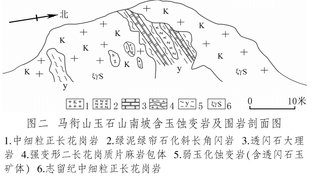馬銜山玉礦分布在馬銜山東南部的玉石山(圖版一),海拔3028米。山上出露的地質(zhì)體主要為古元古界馬銜山巖群、中元古代片麻二長花崗質(zhì)巖[3]和志留紀(jì)正長花崗巖及正長巖。馬銜山巖群的巖性為黑云斜長片麻巖、變粒巖、斜長角閃巖和白云質(zhì)大理巖,巖石普遍遭受了韌性變形,變余糜稜巖發(fā)育。志留紀(jì)巖漿侵入期后熱液活動較強,石英脈細(xì)脈發(fā)育,局部見螢石礦化或礦床[4]。玉礦化主要產(chǎn)于馬銜山巖群與志留紀(jì)正長花崗巖和正長巖接觸帶上(圖版二),具體賦存在與白云質(zhì)大理巖的接觸部位,是正長花崗巖及正長巖與鎂質(zhì)大理巖接觸交代蝕變的產(chǎn)物[5]。花崗巖與片麻巖、變粒巖和斜長角閃巖接觸界線附近巖石雖有蝕變,但不見玉化蝕變巖或玉石出露。在近山頂開采玉石揭露的一個地質(zhì)剖面清晰地顯示了這些特征(圖二)。該剖面大致呈東西走向,長約50米,馬銜山巖群多呈殘留體出露,斜長角閃巖綠泥綠簾石化強烈,大理巖普遍發(fā)生蝕變,形成透輝透閃石大理巖,緊靠花崗巖接觸地帶發(fā)育窄窄的透閃石玉礦帶。現(xiàn)在人們找玉,也主要在該剖面上的花崗巖和鎂質(zhì)大理巖的接觸帶上鑿洞,在接觸帶上見有多處采挖玉石的洞穴。在該剖面西側(cè)約50米,發(fā)育有正長巖與大理巖的混染帶,肉紅色正長巖中包裹混染著大量灰綠色透閃透輝大理巖,部分已蝕變?yōu)橥搁W透輝石巖,且質(zhì)地較細(xì)膩,成為半玉化巖石。剖面和周圍地質(zhì)特征表明,玉礦的形成是早古生代志留紀(jì)花崗質(zhì)雜巖體侵入到古元古代鎂質(zhì)大理巖,發(fā)生接觸交代蝕變作用的結(jié)果,在兩種巖石接觸帶形成玉礦體。但并不是蝕變帶中的巖石都是透閃石玉石,透閃石玉在蝕變帶中多呈雞窩狀或不規(guī)則狀分布,少量呈脈狀出露。從剖面及部分采坑的規(guī)模來看,玉礦體向深處有變大、變好的趨勢,這主要受控于接觸面產(chǎn)狀,在傾角較緩處礦體相對較大。橫向上在背離接觸面方向圍巖具有從透閃石玉到透閃透輝石玉、透閃透輝石大理巖再到含透閃石大理巖的變化特征,反映了交代蝕變強度與接觸帶溫度及熱液成分變化的密切關(guān)系。從玉礦體到蝕變圍巖由于成分和結(jié)構(gòu)的變化出現(xiàn)一系列不同類型的玉石或巖石。我們在剖面上采集到一些小塊的淡綠色玉料(圖版三)和出露較寬的微晶大理巖,經(jīng)偏光顯微鏡下薄片鑒定和XRF檢測,確定有透閃石玉、透輝透閃玉、透閃透輝石玉、透閃透輝石大理巖和含透閃石大理巖等,這與馬家窯遺址出土的齊家文化時期大部分玉質(zhì)品玉料類型基本一致[6]。部分地段近礦圍巖還有透輝石巖、透輝矽卡巖、矽卡巖化大理巖、蛇紋石化大理巖、斜長透輝石巖等。玉石山的采洞(坑)由于資源與環(huán)境保護的要求,大多已被填埋,但仍可見采坑殘留的位置。采洞(坑)均位于大理巖與正長花崗巖接觸帶靠近大理巖一側(cè),這也間接顯示了玉礦體的位置。此外,玉石山花崗巖中石英細(xì)脈較發(fā)育,局部可見螢石礦化,反映了花崗巖侵入期后低溫?zé)嵋夯顒尤暂^強,對玉礦也有一定的改造影響。