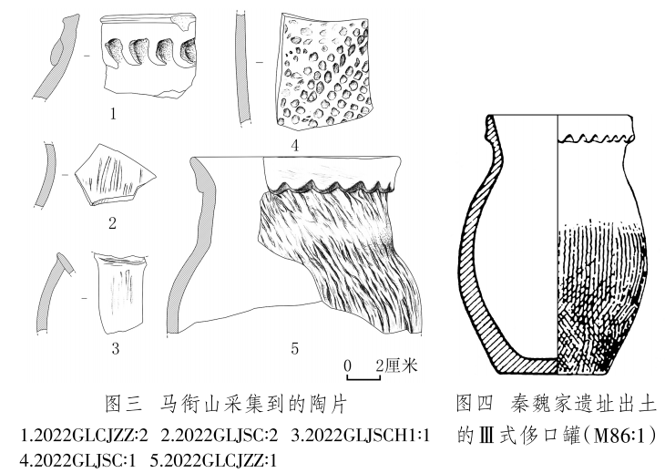 陶片 2片,2022GLCJZZ∶1,罐殘片,夾砂紅陶,腹部以下缺失。侈口,上有煙熏痕跡。短頸,頸上部有一圈鋸齒狀凸飾,鼓腹,頸部和腹部滿飾粗繩紋。復(fù)原口徑12、器壁厚0.6~1、殘高10厘米(圖三,5)。與秦魏家遺址出土的齊家文化Ⅲ式侈口罐(圖四)[16]形制相似。2022GLCJZZ∶2,罐口沿殘片,夾砂紅陶??谘叵掠性卵罓罡郊佣鸭y。口沿殘長5.3、殘高4.8、厚0.7厘米(圖三,1)。