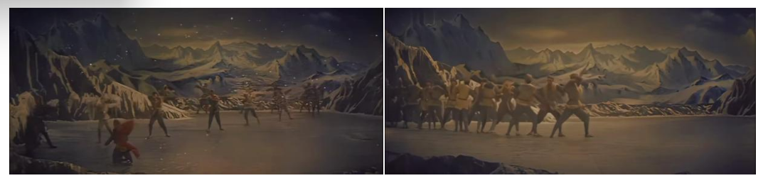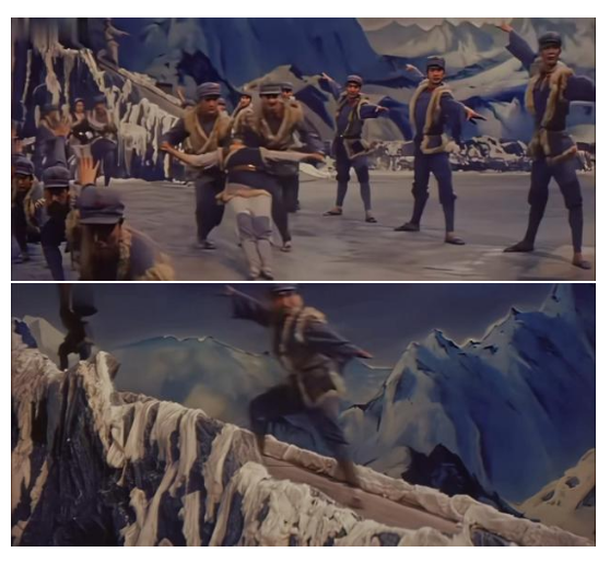 在表現(xiàn)行軍征程時,舞者以身體前傾的大跨步姿態(tài),沿群山布景走出巨大的“S”型曲線。這不是簡單的隊形變換,它首先在視覺上營造出千軍萬馬綿延不絕的雄渾意象。同時,“S”形曲線本身藝術化地傳達了“道路是曲折的,前途是光明的”這一革命哲理。舞者整齊劃一、重心下沉的堅定步伐,與沙幕光影營造出的風沙漫天效果相結(jié)合,共同體現(xiàn)紅軍在艱難險阻中依然定向不移的鋼鐵意志。