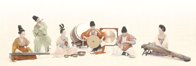 淡黃色的背景如宣紙鋪陳,樂師們身著朱紅圓領(lǐng)袍、艾綠上衣、藕色絹衫等,或撫古琴,或吹笛簫,或擊大鼓……演奏的是中國(guó)傳統(tǒng)樂器,流淌的樂音卻是電影《哈利·波特》主題曲、巴赫《G弦上的詠嘆調(diào)》……