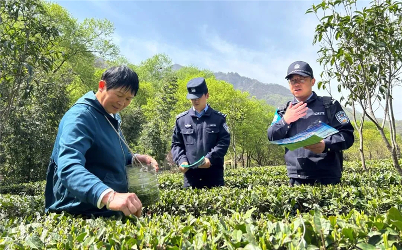 清明節(jié)后,隴南市康縣的茶樹鮮嫩的新芽迎風(fēng)而立,茶農(nóng)們穿行在茶樹間熟練地采摘嫩芽,同樣忙碌不歇的還有轄區(qū)派出所的民警們,他們上茶山、進茶園、問需求、解糾紛,成為春茶豐收畫卷中的一抹別樣的“警”色。