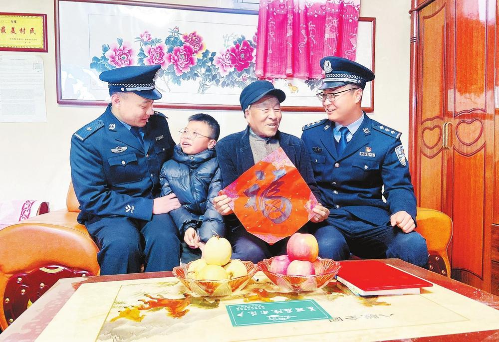 “史大爺,過年好呀!我們送福來了。”民警小李一邊說著,一邊將一張福字遞到史大爺手中。史大爺接過福字,笑得合不攏嘴,激動(dòng)地說:“謝謝你們啊,警察同志,這福字往門上一貼,年味兒一下子就濃了!平日里多虧了派出所民警的照顧,這大過年的還想著我們,你們辛苦了。”