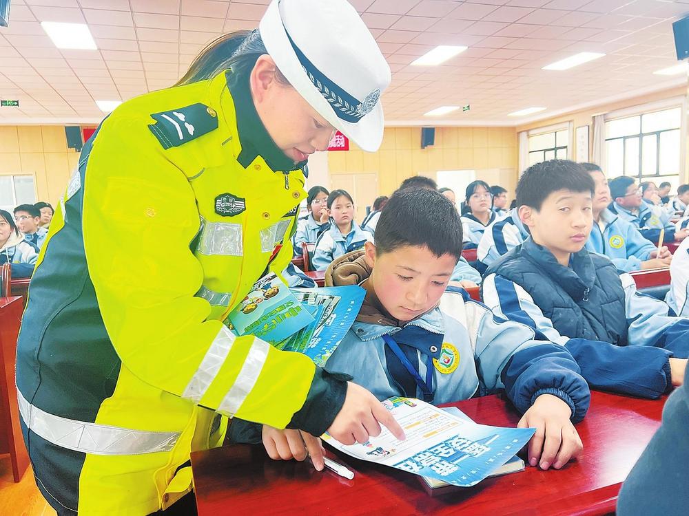民警向?qū)W生講解交通安全知識(shí)。2月26日,臨潭縣公安局交警大隊(duì)組織民警走進(jìn)臨潭縣回民中學(xué),開展交通安全進(jìn)校園宣傳活動(dòng)。 新甘肅·甘肅法治報(bào)記者金凡裕攝