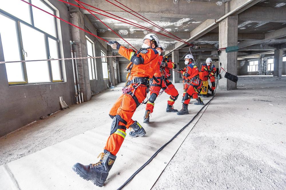 演練現(xiàn)場設(shè)置在民樂縣一處廢棄廠區(qū),精心搭建的模擬廢墟區(qū)真實還原了地震后的慘烈場景:斷裂的預(yù)制板下壓著被困者,傾倒的鋼架阻斷逃生路徑,熊熊燃燒的化工廠冒出濃煙……12個高難度救援科目輪番上演,每一處細節(jié)都直擊地震救援的核心挑戰(zhàn)。