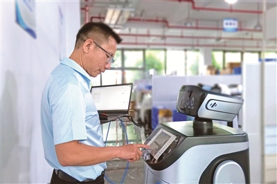 福建省福州市,服務(wù)機(jī)器人應(yīng)用技術(shù)員謝茂皇正在對機(jī)器人產(chǎn)品的功能進(jìn)行調(diào)試。周磊 攝