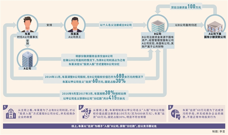 第二,車某的所謂出資行為并非市場投資行為,而是其利用職務(wù)便利獲取本屬于國有公司B公司的確定性預(yù)期收益的犯罪手段。本案中,車某明知其以甲公司名義“入股”時(shí),B公司實(shí)際資產(chǎn)高于注冊(cè)資金100萬元。經(jīng)查,在車某以甲公司名義“入股”B公司時(shí),B公司實(shí)際股權(quán)價(jià)值為680余萬元,車某“出資”60萬元占股30%,明顯不符合常理,換言之,車某“出資”60萬元不應(yīng)獲得30%股權(quán)。車某的真實(shí)目的是在不承擔(dān)市場風(fēng)險(xiǎn)的前提下,利用擔(dān)任A公司董事長的職務(wù)便利,將A公司確定能夠盈利的融資業(yè)務(wù)交給B公司經(jīng)營,并在確認(rèn)B公司能夠盈利的情況下,以“出資”為幌子“入股”B公司,獲取“分紅款”,應(yīng)以貪污罪論處。