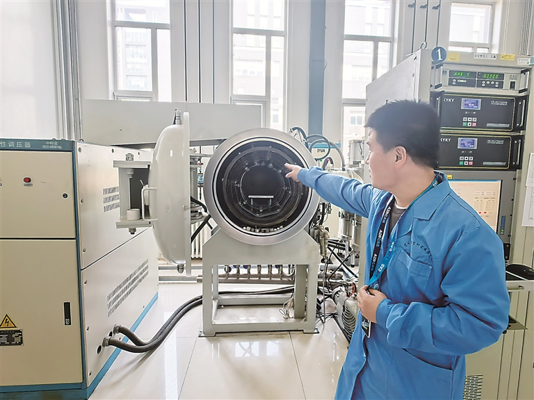 中國(guó)科學(xué)院空天信息創(chuàng)新研究院行波管工藝技術(shù)負(fù)責(zé)人劉泳良介紹高溫真空釬焊爐的用途。左翰嫡 攝