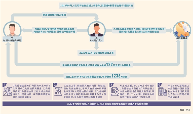 其中,2016年6月,E公司符合創(chuàng)業(yè)板上市條件,擬引進G私募基金和H私募基金進行增資擴股。乙為感謝甲在企業(yè)用地審批等方面提供的幫助,提議安排甲通過投資G私募基金(該基金是專門為投資未上市的E公司而成立的股權投資基金,按照每股5.5元的價格取得E公司股本600萬股,并辦理相應的變更登記手續(xù))間接持有E公司原始股,并告知甲E公司擬上市情況以及其會與G私募基金簽訂對賭協(xié)議(若E公司未實現上市,G私募基金有權要求乙原價回購,并按照年利率10%支付補償款),甲無需承擔市場風險,穩(wěn)賺不賠,甲表示同意。此后,乙向G私募基金負責人施壓,暗示若拒絕甲參與投資將削減G私募基金認購E公司的股份額度,并將該額度交由其競爭對手H私募基金認購。隨后,甲違規(guī)使用銀行貸款資金以其親戚名義投資132萬元至G私募基金(根據相關規(guī)定,私募基金投資者應當具備相應資金實力,不得用貸款資金從事股本權益性投資,甲的行為不符合規(guī)定)。2019年6月,I私募基金以每股11.52元溢價收購G私募基金持有的部分E公司股份。2020年12月,E公司在創(chuàng)業(yè)板上市。經查,至2024年4月G私募基金清倉,甲凈獲利1236萬余元。