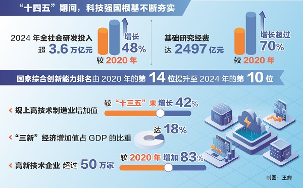 “這五年,科技創(chuàng)新能力穩(wěn)步提升,科技強(qiáng)國根基不斷夯實。”陰和俊說,我國科技投入持續(xù)增加,2024年全社會研發(fā)投入超3.6萬億元,較2020年增長48%;基礎(chǔ)研究經(jīng)費達(dá)2497億元,較2020年增長超過70%,在量子科技、生命科學(xué)、物質(zhì)科學(xué)、空間科學(xué)等領(lǐng)域取得一批重大原創(chuàng)性成果;國家實驗室體系建設(shè)穩(wěn)步推進(jìn),國家科研機(jī)構(gòu)、高水平研究型大學(xué)科研能力不斷提升,科技領(lǐng)軍企業(yè)加快培育成長;北京、上海、粵港澳大灣區(qū)國際科創(chuàng)中心支撐引領(lǐng)和輻射帶動作用不斷增強(qiáng),深圳-香港-廣州躍居全球百強(qiáng)創(chuàng)新集群榜首;國家綜合創(chuàng)新能力排名由2020年的第14位提升至2024年的第10位。