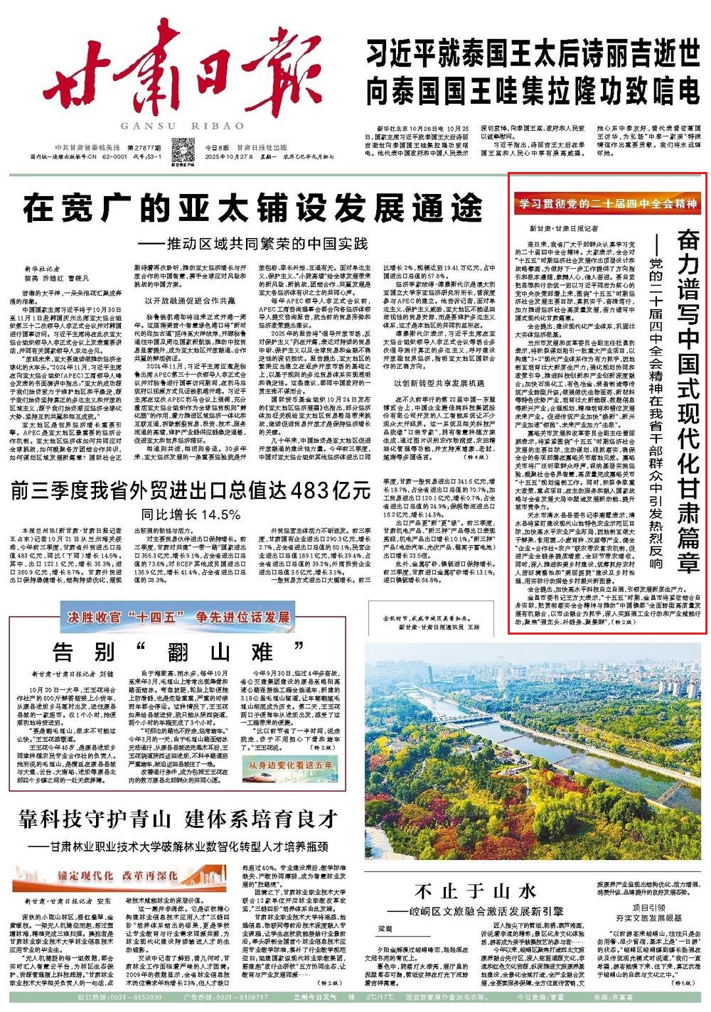 《甘肅日?qǐng)?bào)》2025年10月27 第1版