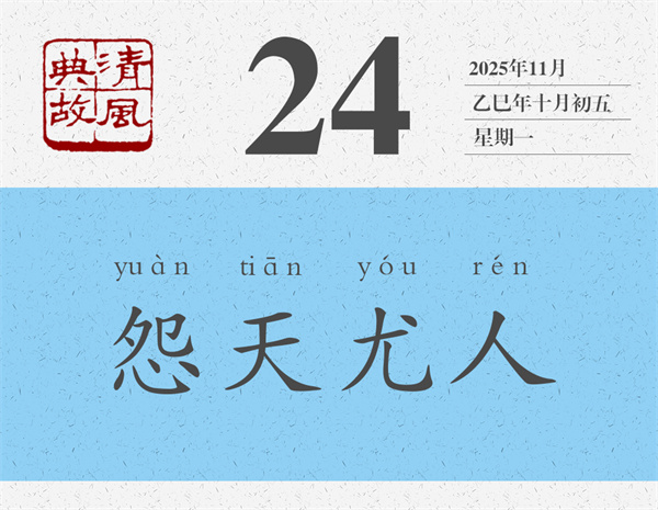 朱熹《論語集注》對“不怨天,不尤人”的理解要簡潔得多,也深刻得多:“不得于天而不怨天,不合于人而不尤人。”《荀子·榮辱》則更進一層:“自知者不怨人,知命者不怨天。”能夠看清自己的人就不會去埋怨別人,那么埋怨誰呢,當然是埋怨自己了;能夠知道自己命運的人就不會怪罪于天,那么怪罪誰呢,當然是怪罪自己了。后世則反“不怨天,不尤人”之意,而以“怨天尤人”為典,形容遇到不稱心的事情,或者事情不順利的時候,一味埋怨天,一味責怪別人。言外之意,就是不從主觀上找原因,不在自己身上找問題。宋人李昌齡《太上感應篇》:“苛虐其下,恐嚇于他。怨天尤人,呵風罵雨。”