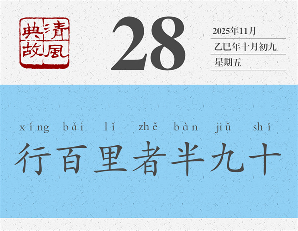 《戰(zhàn)國(guó)策·秦策五》中有一句無(wú)名說(shuō)客規(guī)勸秦王的話:“詩(shī)云:‘行百里者半于九十’,此言末路之難也。”這里的“詩(shī)云”,不是我們平常所說(shuō)的“子曰詩(shī)云”中的“詩(shī)云”。只是一個(gè)連姓名都沒(méi)留下的作者留下的一首詩(shī)中的句子:“行百里者,半于九十。”字面意思是:如果要走一百里路,走到九十里才算走了一半。這是怎么回事呢?這里說(shuō)的不是算術(shù)問(wèn)題,而是說(shuō)最后一段路程總是十分艱難,走完它需要付出更多的努力。