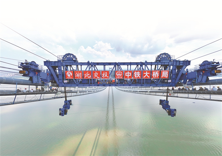 那就自己創(chuàng)造經(jīng)驗(yàn)!湖北交投牽頭聯(lián)合承建單位,在大橋建設(shè)前期進(jìn)行了大量數(shù)據(jù)論證和可行性試驗(yàn),一次次研究優(yōu)化施工方案。他們堅(jiān)持設(shè)備優(yōu)化與工藝創(chuàng)新“雙管齊下”,應(yīng)用纜載吊機(jī)、液壓提升裝置等裝備創(chuàng)新施工方法,順利攻克了難關(guān)。