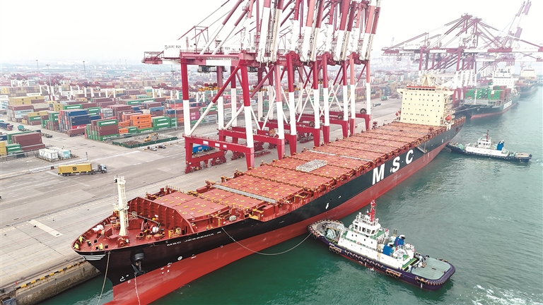 1月4日,澳洲直航新航線首班船舶靠泊山東港口青島港,標志著該港2026年首條外貿(mào)新航線正式開通。圖為澳洲直航新航線首班船舶——“地中海杰西尼亞”輪靠泊山東港口青島港。新華社發(fā)(張進剛 攝)
