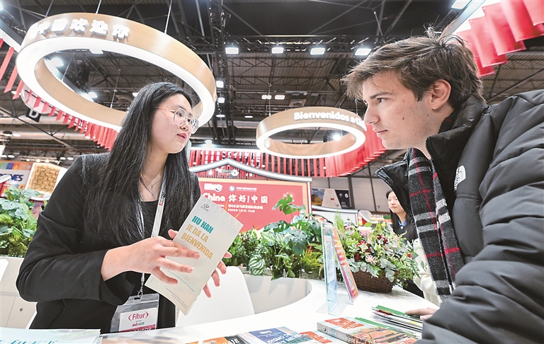 近年來(lái),過(guò)境免簽政策持續(xù)擴(kuò)容、免稅購(gòu)物政策不斷優(yōu)化、“即買即退”適用商店持續(xù)增加……得益于中國(guó)日益開(kāi)放的舉措,越來(lái)越多外國(guó)游客在中國(guó)旅游、購(gòu)物,感受更加開(kāi)放包容、多元?jiǎng)?chuàng)新的中國(guó)。圖為1月21日至25日舉行的馬德里國(guó)際旅游展上,參觀者在中國(guó)展臺(tái)咨詢。新華社記者 程敏 攝