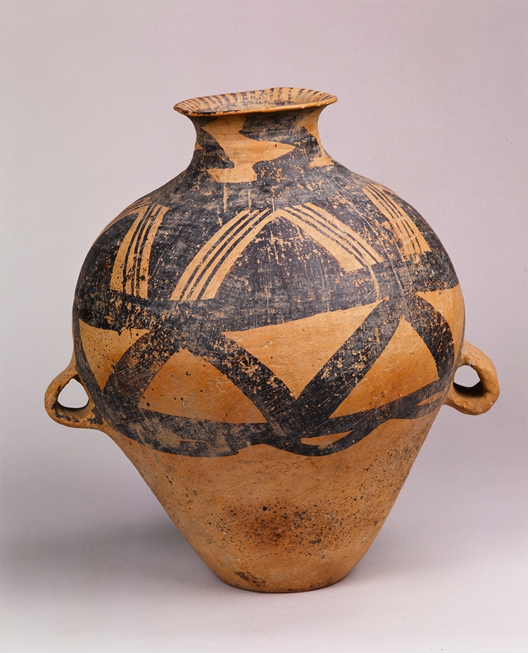 馬家窯文化馬廠類型,高37厘米,底徑10厘米。侈口,短頸,圓肩鼓腹,下腹內收,平底,雙腹耳。
