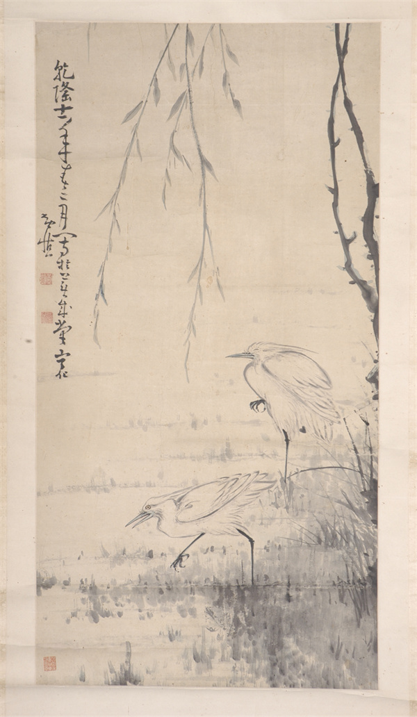 清代,水墨設(shè)色花鳥畫立軸,紙本,作者黃慎。縱高1126厘米,橫寬57.4厘米。款署“乾隆十一年春二月寫于蕪成堂寧化黃慎”。鈐“黃慎”白文方印,“癭瓢”白文方印。柳枝自畫面上方垂下,疏落的柳葉隨風(fēng)搖曳。池塘兩只白鷺,一只閉目獨(dú)立,一只行走覓食。黃慎,福建寧化人,書畫家,為“揚(yáng)州八怪”之一。