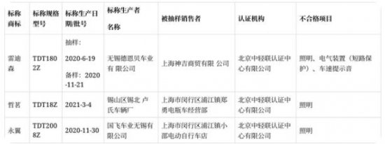 2021年上海市電動自行車產(chǎn)品質(zhì)量監(jiān)督抽查不合格產(chǎn)品