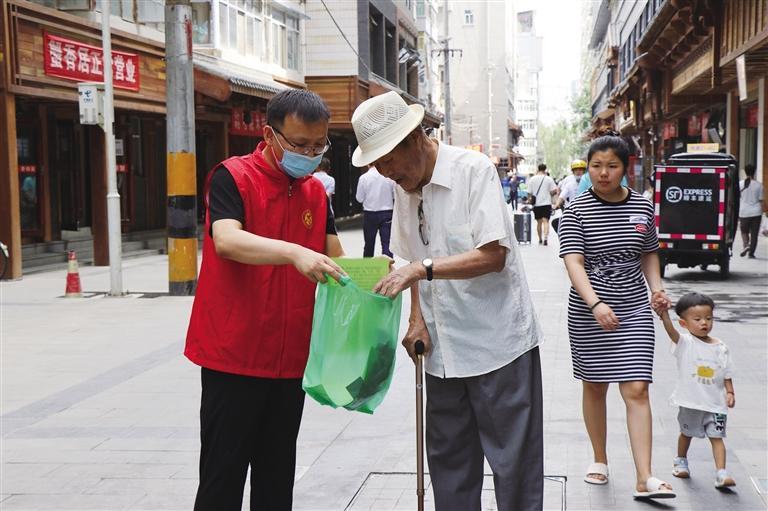 志愿者發(fā)放垃圾分類宣傳資料 王瀟旋 攝