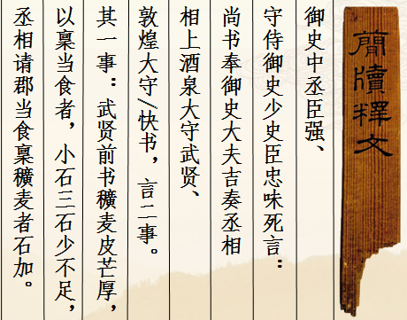此簡為漢宣帝回復(fù)酒泉太守“辛武賢”和敦煌太守“快”奏疏的恩準(zhǔn)詔書,簡文記載的是皇帝詔書中對兩太守奏疏內(nèi)容的復(fù)述。從簡文內(nèi)容看,酒泉太守辛武賢和敦煌太守快給朝廷的奏疏主要涉及兩件事情:一是辛武賢認(rèn)為作為糧草的穬麥因皮厚芒長,如按規(guī)定每人發(fā)放小石三石,會(huì)造成實(shí)際數(shù)量的不足,所以他請求皇帝每石加發(fā)若干。另一件事顯然是敦煌太守快的上書,但文字未能容納于此簡,故不得而知。