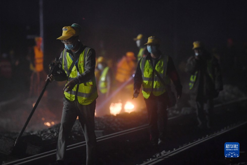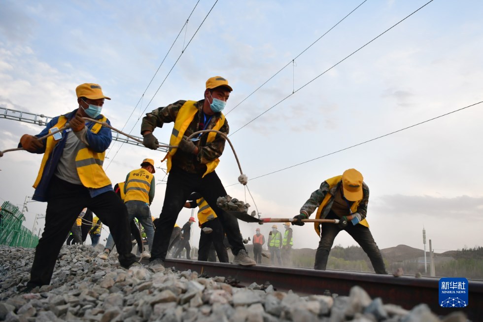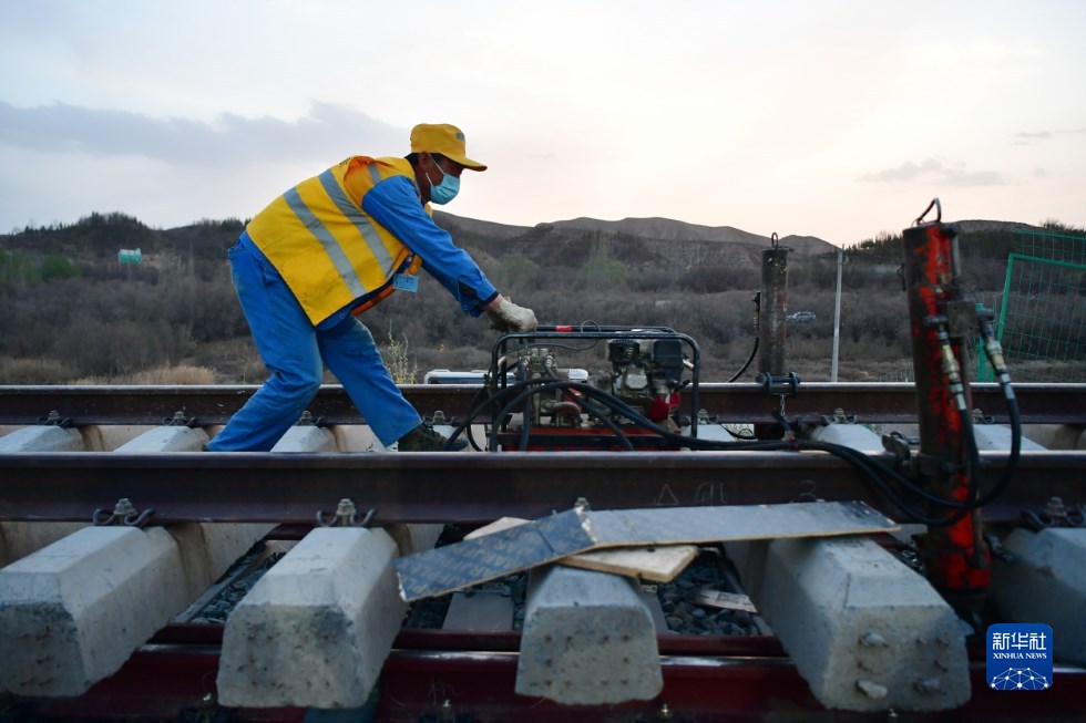 中鐵十一局建設(shè)者在中蘭客專(甘肅段)接入中川城際鐵路道岔插鋪施工現(xiàn)場作業(yè)(4月26日攝)。新華社記者 陳斌 攝