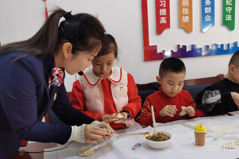 孩子們聽(tīng)老師講傳統(tǒng)習(xí)俗體驗(yàn)包餃子(央廣網(wǎng)發(fā) 唐欣 攝)
