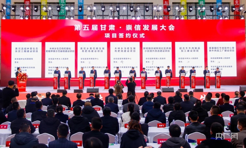 央廣網(wǎng)蘭州3月19日消息(記者邸文炯)3月19日,第五屆甘肅·崇信發(fā)展大會暨強縣域行動招商大會在甘肅省平?jīng)鍪谐缧趴h舉辦,大會共簽約項目49項、簽約金額103.39億元,項目涵蓋煤炭清潔高效利用、綠色建材、平?jīng)黾t牛、生豬、優(yōu)質(zhì)蘋果、設(shè)施蔬菜、文旅康養(yǎng)、生態(tài)環(huán)保等。