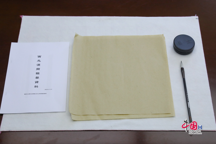 蘭州大學(xué)古文字學(xué)強(qiáng)基計(jì)劃同學(xué)臨摹簡(jiǎn)牘所用的資料與文具(拍攝于7月31日)。中國網(wǎng)記者 鄭偉 攝